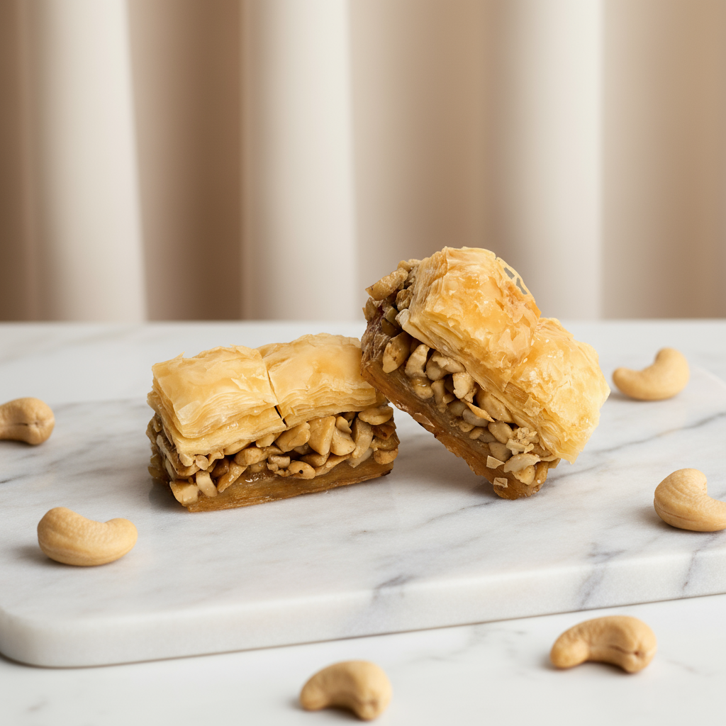 Den rika cashewnötsfyllningen omsluts av tunna lager av gyllene, smörig deg som smälter på tungan. Varje bit erbjuder den perfekta balansen mellan krispighet och mjukhet, med en sötma som aldrig blir överväldigande.