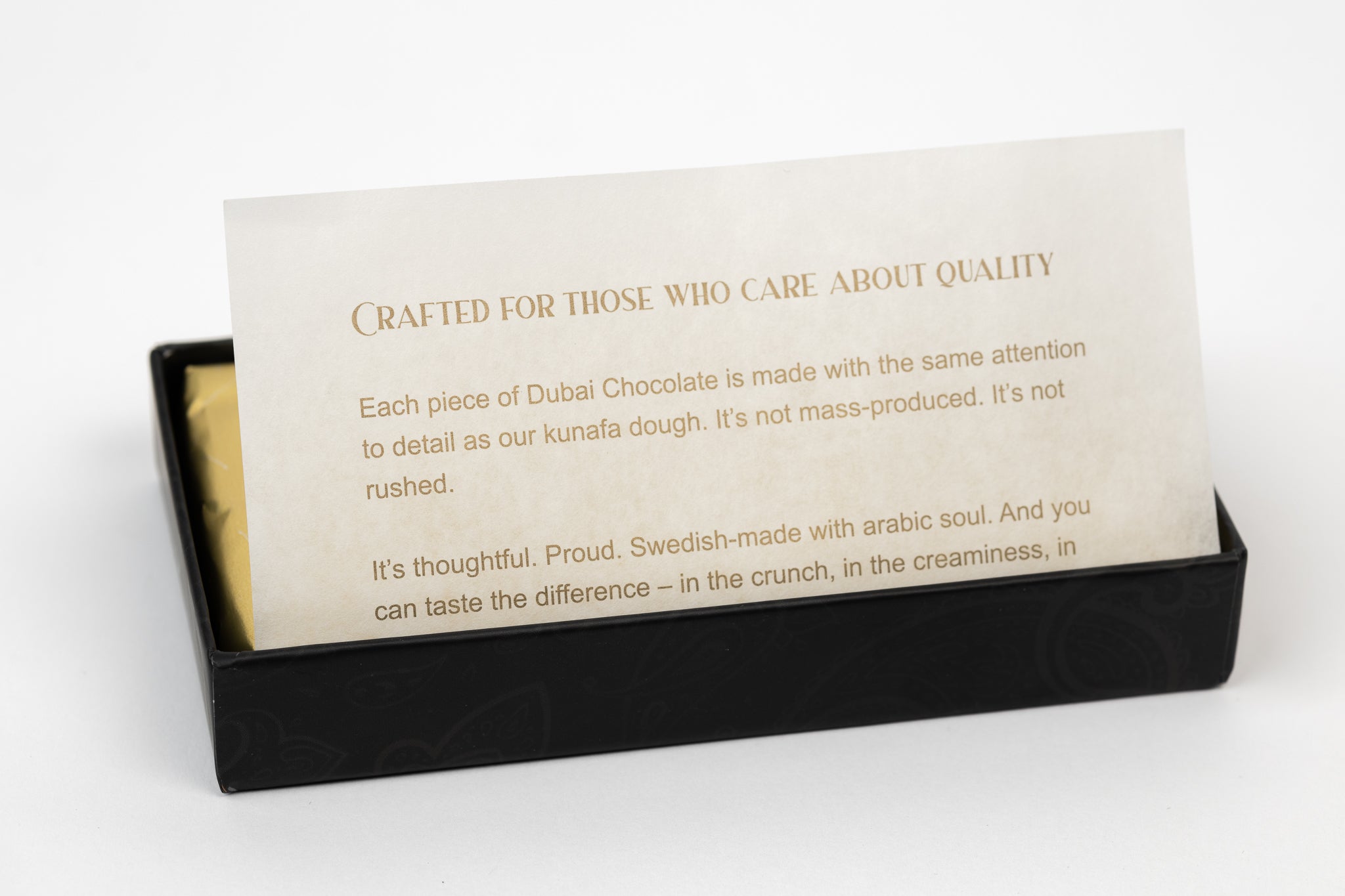 Dubai Chocolate is a modern and exclusive take on the classic Kunafa dessert that has taken the world by storm. Each piece is carefully crafted with only the finest ingredients for an unforgettable taste experience.
