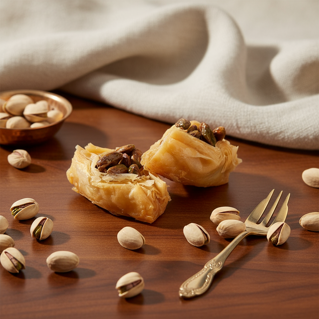 Den rika pistage fyllningen omsluts av tunna lager av gyllene, smörig deg som smälter på tungan. Varje bit erbjuder den perfekta balansen mellan krispighet och mjukhet, med en sötma som aldrig blir överväldigande.